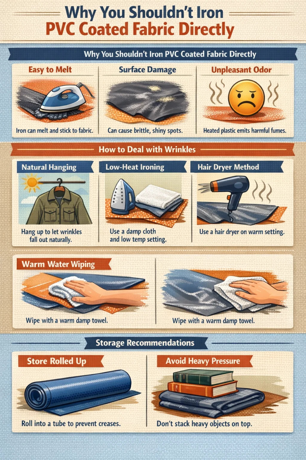 Menyeterika suhu rendah dengan penghadang kain: Jika anda benar-benar mesti menggunakan seterika, tetapkannya pada suhu paling rendah. Letakkan kain kapas tebal dan lembap di belakang kain bersalut PVC (sebelah tanpa salutan) sebagai penimbal. Jangan biarkan seterika terus menyentuh kain, dan pastikan seterika sentiasa bergerak; jangan sekali-kali meninggalkannya di satu tempat.