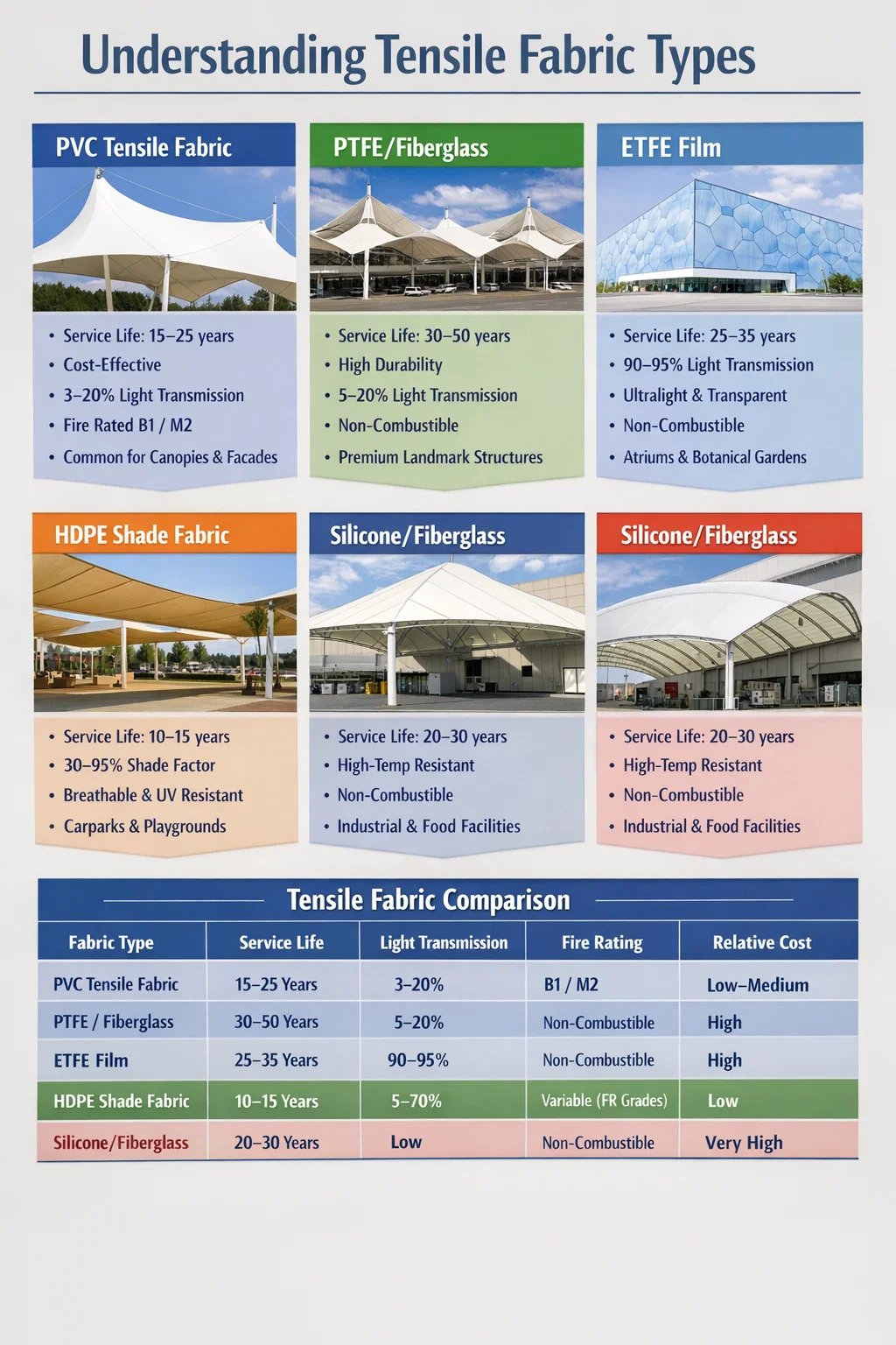 - Gred 5–6 (750–1,100 g/m²): Kuda kerja seni bina komersial — kanopi tegangan, laluan pejalan kaki, tempat perlindungan transit dan pelapisan muka depan. Kekuatan tegangan 5,000–7,500 N/5 cm. Biasanya dinilai hayat perkhidmatan 15–20 tahun dengan lapisan atas PVDF.