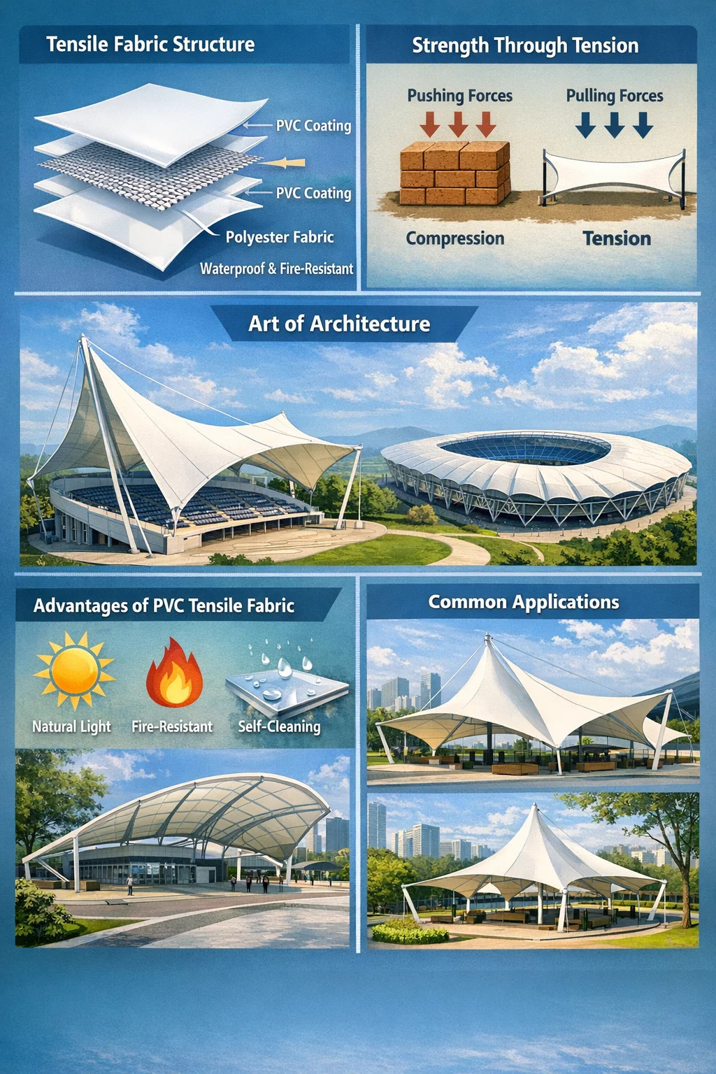 Ringan dan telus: Ia boleh meliputi kawasan yang sangat besar (seperti keseluruhan grandstand stadium), tetapi ia tidak memerlukan lajur yang padat di bawahnya, memberikan rasa ruang yang sangat baik.
