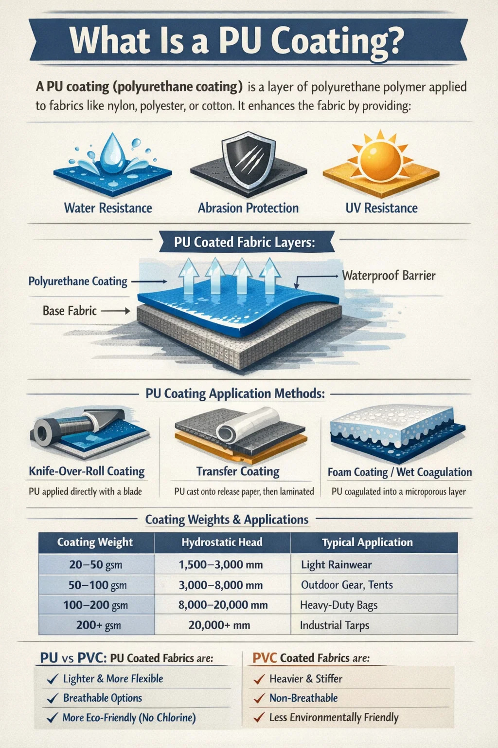 Dari segi praktikal, apabila anda mengendalikan fabrik bersalut PU, anda menyentuh bahan yang telah direka bentuk untuk berkelakuan sangat berbeza daripada rakan sejawatnya yang tidak bersalut. Lapisan poliuretana biasanya berkisar antara 0.05 mm hingga lebih daripada 1.5 mm ketebalan , bergantung pada penggunaan akhir - fabrik pakaian hujan yang ringan mungkin menerima salutan nipis hanya 20–30 gram setiap meter persegi (gsm), manakala kain terpal industri tugas berat mungkin membawa salutan melebihi 200 gsm.