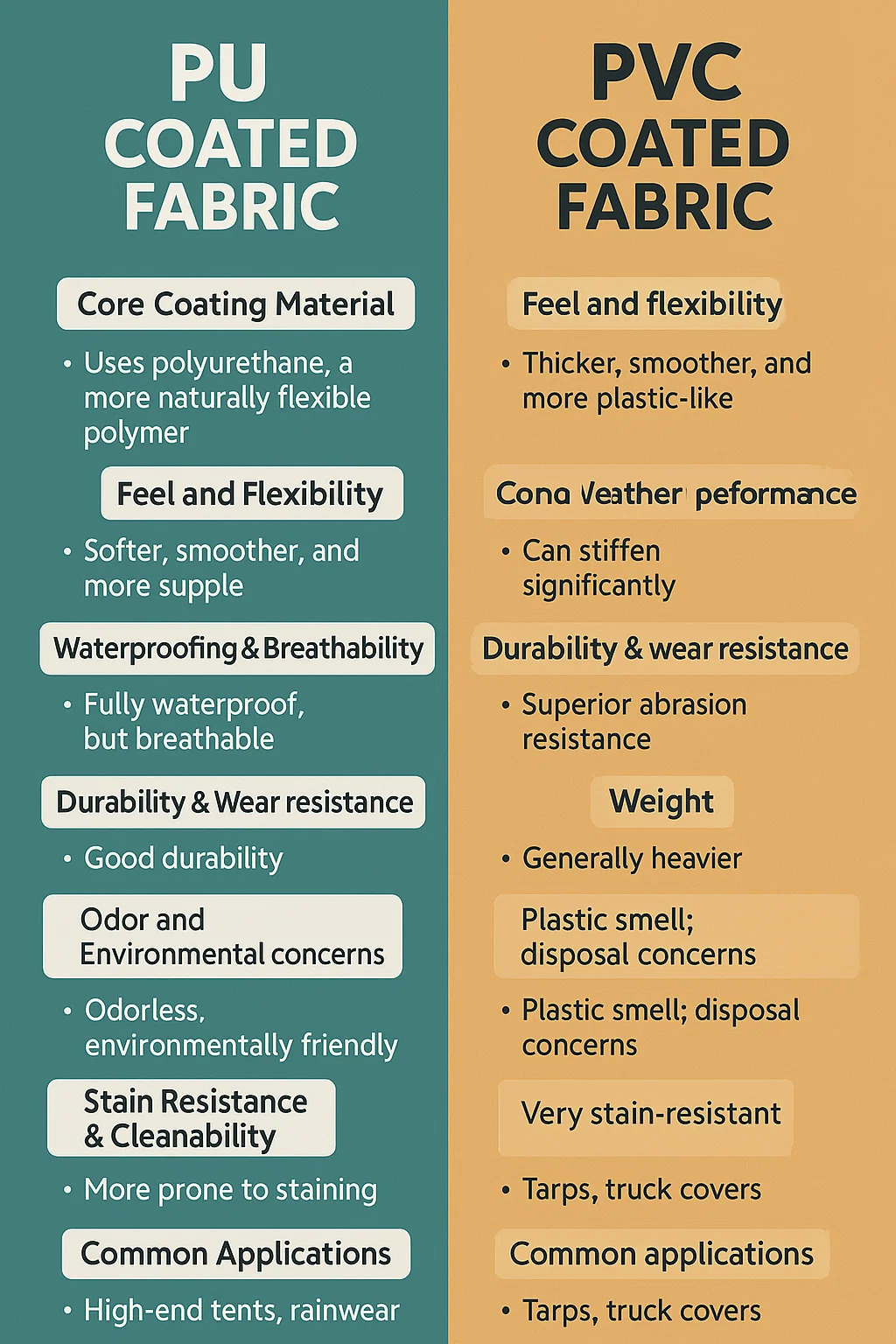 Berikut adalah pecahan perbezaan utama antara kain bersalut PU dan Fabrik bersalut PVC , berdasarkan ciri dan aplikasi praktikal: