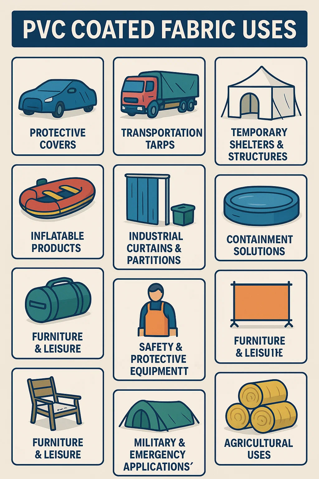 Inilah pecahan kegunaan biasa Fabrik bersalut PVC , mencerminkan aplikasi praktikalnya: